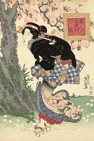 Vrouw in kimono met bloem- en vlinderpatroon, tegen de wind in lopend, bij boom vol met roze kersenbloesem; op de grond afgewaaide blaadjes. (bijinga)