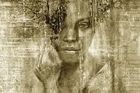 Een donkere schoonheid luistert naar de muziek. Toegewijd. Geschilderd op een collage van oude bladmuziek met nostalgisch schrift. Retro. Geabstraheerd penseelwerk met sterke texturen. Het zicht is gedeeltelijk ontnomen, ze houdt een hand voor haar gezicht. In haar gedachten hoor je een heel orkest op de achtergrond spelen, de sfeer is plechtig. Verminderde kleuring in koele grijze, olijf en bruine tinten.