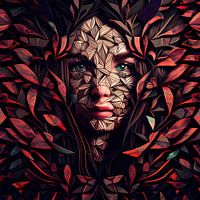 Een prachtig digitaal kunstportret van een mooie vrouw wiens vorm is opgebouwd uit bladeren. Het symmetrische ontwerp bevat gedetailleerde patronen op haar gezicht, waarbij organische texturen worden gecombineerd met ultra-realistische precisie. Het kunstwerk in dieprood en bruin tegen een donkere achtergrond straalt een etherische en mysterieuze aanwezigheid uit. De scherpe focus en het hoge detailniveau dragen bij aan de betoverende visuele aantrekkingskracht.