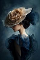 Een betoverend portret in donkere, mysterieuze tinten waar een sierlijke vrouw getooid is met een opvallende, roomkleurige roos als hoofddeksel. De delicate transparantie van marine-kleurige tule vormt een dramatisch contrast met de zachte huidtinten en de imposante bloem. Het spel van licht en schaduw creëert een tijdloze, bijna schilderachtige sfeer die doet denken aan klassieke portretten in een modern jasje.