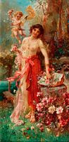 Jonge vrouw in een tuin vol met bloemen in volle bloei. De meid staat naast een lieflijk engeltje die met bloesem strooit.