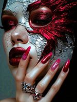De lange, gemanicuurde nagels in roze en rood met glitteraccenten voegen glamour en theatraliteit toe aan het motief. Verschillende sierlijke ringen met doodshoofdmotieven en edelstenen benadrukken de raadselachtige uitstraling van de figuur en thematiseren macht, vergankelijkheid en schoonheid. Dit digitale kunstwerk is ideaal voor verzamelaars van surrealistische, gothic of avant-garde kunst en past perfect in moderne ruimtes, modestudio's of character design portfolio's.