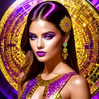 Dit betoverende digitale kunstwerk toont een opvallend mooie vrouw gedrapeerd in een luxe combinatie van paarse en gouden tinten.