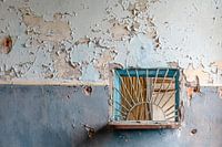 Deze foto toont een verweerde binnenmuur waarop lagen verf in grote schilfers loslaten, alsof de geschiedenis zich laag voor laag blootgeeft. De muur bestaat uit twee tinten blauw die ooit helder moeten zijn geweest, maar nu vervaagd, verkleurd en beschadigd zijn door vocht, kou en tijd. De bovenste helft is bedekt met afbladderende…