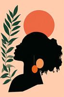 Een krachtig profiel omlijst door zachte, organische vormen. Een gloeiende zonnecirkel straalt warmte uit, terwijl de gestileerde bladeren het beeld tot leven brengen en harmonie creëren. De golvende krullen en opvallende oorbellen voegen een elegante, eigentijdse touch toe. Een viering van vrouwelijkheid en innerlijke kracht die…