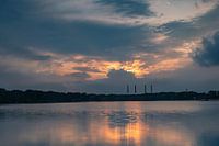 De schoorstenen van de elektriciteitscentrale achter de Allersee in Wolfsburg bij zonsondergang.