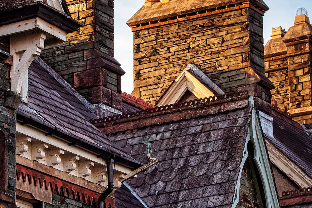 Typisch Engelse schoorstenen in het stadje Keswink bij ondergaande zon (Lake District, Cumbria).