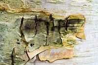 Deze afbeelding is een detailopname van de schors van een goudberk. Er laten steeds delen van de schors los waardoor het een bijna abstract beeld oplevert.