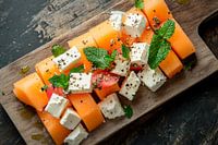 Frisse kleuren en levendige texturen komen samen op een rustieke houten plank om een heerlijk arrangement te creëren. Sappige meloenplakjes ontmoeten romige feta, afgemaakt met geurige muntblaadjes en pittige peper. Deze culinaire compositie verandert elke keuken in een uitnodigende plek om te experimenteren en te genieten. Ideaal voor…