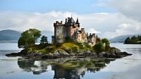 In het schilderachtige landschap staat een imposant Schots kasteel, majestueus oprijzend uit het water van een betoverend meer. Zijn oude stenen muren getuigen van eeuwen geschiedenis en roemrijke verhalen. De omringende natuur weerspiegelt zich in het serene wateroppervlak, waardoor een adembenemende weerspiegeling ontstaat. Het kasteel straalt een aura van mysterie en grandeur uit, een tijdloos symbool van Schotse trots en romantiek.