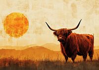 Een majestueuze hooglandkoe met lange, gebogen horens staat op de voorgrond tegen een oranjekleurige lucht bij zonsondergang, genesteld in een rustiek landelijk landschap. De scène is geschilderd in de stijl van een olieverfschilderij met warme tinten en zachte penseelstreken om het een vintage gevoel te geven.