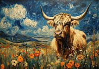 Olieverfschilderij van een hooglandkoe in een weiland in de stijl van Van Gogh, met een donkerblauwe lucht en wolken, oranje klaprozen en gele bloemen, glooiende heuvels en groen gras. De koe heeft wit, pluizig haar op haar hoofd, majestueuze horens en een serene uitdrukking. Het schilderij heeft impressionistische penseelstreken, een getextureerd doek en heldere, dromerige kleuren.