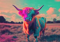 Een levendige, retro-geïnspireerde afbeelding van een hooglandkoe in een weiland, weergegeven in glitch art-stijl. De afbeelding toont de karakteristieke lange, ruige vacht en gebogen horens van het hooglandras tegen een achtergrond van weelderige, kleurrijke vegetatie. Het glitch-effect geeft de afbeelding een unieke, vervormde…