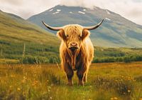 Een foto van een Schotse Highland koe op de voorgrond met bergen en groen erachter. De koe heeft lang haar op haar kop en nek, dat lichtbruin of goudbruin van kleur is. Ze heeft ook grote hoorns die van voren naar achteren omhoog buigen. Voor haar staan hoge grassen en wilde bloemen. De lucht boven de bergen is niet te zien, maar er lijken wat wolken op de top te zijn.