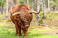 Stoere Schotse Hooglander in het Wezeperheide natuurgebied op de Veluwe in Gelderland tijdens een mooie zomerdag.