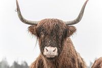 Portret van een Schotse Hooglander in de sneeuw tijdens de winter. De Schotse Hooglanders worden ingezet bij het natuurbeheer op de Veluwe om ervoor te zorgen dat heidegebieden niet dichtgroeien.