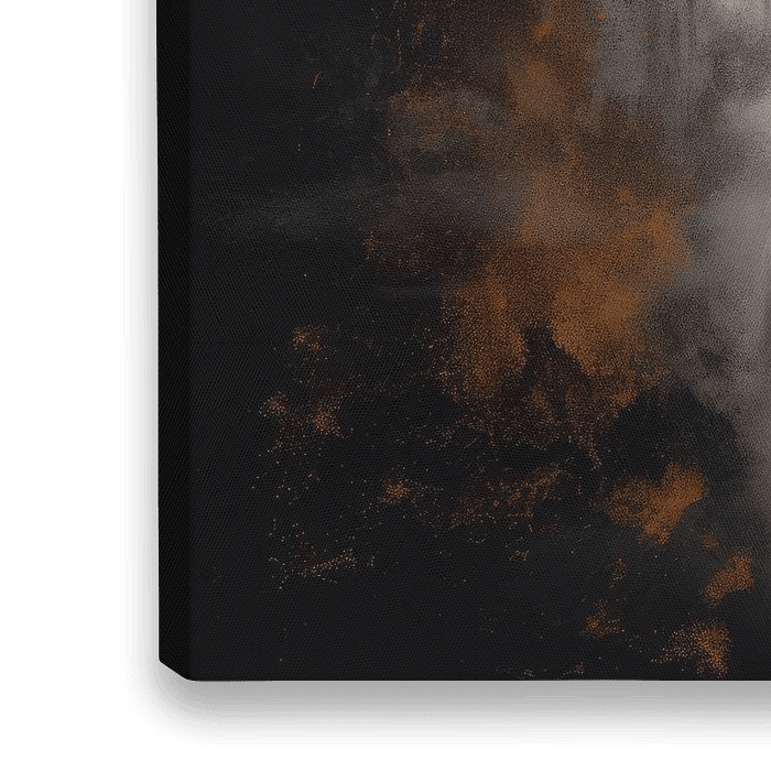 Een dramatisch portret in olieverfstijl van een Schotse Hooglander met de karakteristieke horens en de wollige vacht. De achtergrond van het portret is geschilderd in warme donkere grijs- en zwarttinten, waardoor de nadruk volledig op de Hooglander ligt en een gevoel van diepte aan het portret geeft.