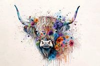 Dit prachtige aquarel kunstwerk toont het imposante hoofd van een Schotse Hooglander, omgeven door een kleurrijke mix van wilde bloemen. Het vacht van het dier is kleurrijk en is omringt met de fraaie tinten van de bloemen, waardoor een fraai geheel ontstaat.