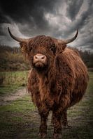 Een door de regen natte schotse hooglander met Hollandse donkere luchten