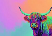 Abstract, kleurrijk hoogland koeienportret met regenboogachtergrond, pop-art stijl. De eenvoudige achtergrond en minimalistische stijl creëren een vectorillustratie met een hoge resolutie, hoge kwaliteit en veel detail. Dit digitale schilderij ziet er hyperrealistisch uit met olieverf op canvas, zonder tekst in de afbeelding. De…