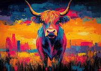 Abstract schilderij van een hooglandkoe, met levendige kleuren en een stedelijk stadslandschap op de achtergrond. Het schilderij heeft getextureerde penseelstreken, vette schaduwen en warme verlichting bij zonsondergang, met gedetailleerde vacht en hoorns. De koe staat hoog op een grasveld.