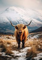 Een majestueuze hooglandkoe staat voor de besneeuwde bergen, haar dikke vacht en lange horens benadrukken haar wilde schoonheid.