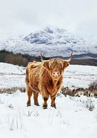 Een schattige Highland koe in de besneeuwde Schotse Hooglanden met de Ben Lomond berg op de achtergrond. De foto legt haar vertederende gelaatstrekken en het rustige winterlandschap vast.