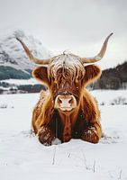 Een schattige hooglandkoe met lange horens en een prachtige vacht ligt in de sneeuw en kijkt je nieuwsgierig aan, van haar kop tot haar voeten. Voor haar ligt een eindeloos wit veld bedekt met zware sneeuw. De bergen in de verte verbergen haar helemaal.