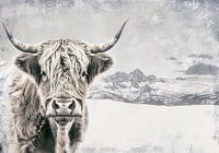 Dubbele belichting van een hooglandkoe met besneeuwde bergen op de achtergrond, gedempte kleuren, gedetailleerde textuur van vacht en hoorns, monochroom kleurenschema, zachte belichting die zachte schaduwen op haar gezicht creëert, vintage effect voor een antieke look, grote witte ruimte bovenop voor tekst of ontwerp, hoge resolutie.