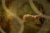 Sierlijke lijnen en batik motieven omgeven de Schotse Hooglander.