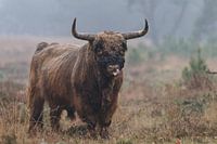 Een schotse Hooglander stier die staat op de Veluwezoom in de motregen die zachtjes op zijn harige vacht valt. Stoer in het landschap staat deze grote jongen.