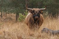 Een schotse Hooglander stier die staat op de Veluwezoom in de motregen die zachtjes op zijn harige vacht valt. Stoer in het landschap staat deze grote jongen.