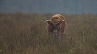 Een schotse Hooglander stier die staat op de Veluwezoom in de motregen die zachtjes op zijn harige vacht valt. Stoer in het landschap staat deze grote jongen.