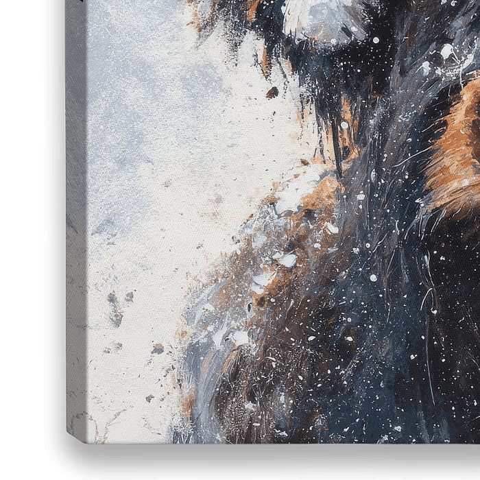 Deze charmante aquarel toont een Schotse hooglander in een winterse setting, met een rode kerstmuts speels op zijn harige kop. De dikke vacht is bedekt met sneeuwvlokken, wat het gevoel van kou en kerst versterkt. De levendige penseelstreken en het gebruik van koele en warme tonen zorgen voor een speels contrast, terwijl de expressie…