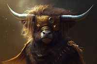 Het schilderij vangt de essentie van zowel de schotse hooglander als superhelden, wat resulteert in een uniek en vermakelijk kunstwerk. De kleuren zijn warm en uitnodigend, en de details en texturen zijn prachtig vastgelegd.