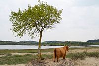 Een Schotse Hooglander staat op de uitkijk onder een boom in de Kennemerduinen bij Parnassia Bloemendaal.