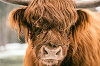 Portret van een Schotse Hooglander in de sneeuw tijdens een vroege lentedag in een bos. De Schotse Hooglanders worden ingezet bij het natuurbeheer op de Veluwe om ervoor te zorgen dat heidegebieden niet dichtgroeien.