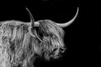 Zwart/wit portret van een Schotse Hooglander, een van de grote grazers in de natuurgebieden.