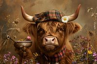 Dit betoverende kunstwerk toont een charmante Schotse Hooglander, gekleed in een traditionele geruite muts met een bloem erin, terwijl hij een kopje met bloemen en kruiden vasthoudt. De warme tinten van de achtergrond, gecombineerd met de zachte, wilde bloemen die de scène omlijsten, geven het geheel een rustiek en speels karakter. De levendige expressie van de hooglander en de delicate details van de flora maken dit werk perfect voor liefhebbers van boerderij- en natuurkunst met een fantasievolle twist.