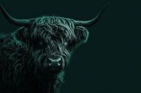 Deze intrigerende kunstafbeelding toont een Schotse hooglander gehuld in een diepdonkere achtergrond, waarbij het dier oplicht in een surrealistische, bijna neonachtige gloed. De gedetailleerde textuur van zijn gekrulde vacht en imposante horens wordt dramatisch geaccentueerd door het licht, wat een mystieke sfeer oproept. Het contrast…