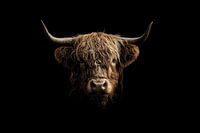 Deze indrukwekkende digitale kunstafbeelding toont een Schotse hooglander, frontaal in beeld, gevangen in een warme gloed van goudtinten tegen een diepe zwarte achtergrond. De scherpe belichting benadrukt de textuur van zijn warrige vacht en imposante horens, waardoor het beeld een bijna sculpturale kwaliteit krijgt. De directe blik van…