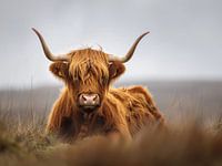 Dit serene portret toont een Schotse Hooglander zittend in een uitgestrekt, rustig landschap. De zachte, roodbruine tinten van de vacht en de imposante hoorns van het dier staan in mooi contrast met de grijze lucht en het wuivende gras. De eenvoudige, natuurlijke setting benadrukt de kracht en rust van de Hooglander, waardoor dit beeld…