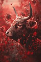Deze fascinerende kunstafbeelding toont een majestueuze hooglander omringd door een zee van vurige rode bloemen, badend in warm licht. De intense rode tinten symboliseren kracht en passie, terwijl de ruwe textuur van de vacht en de hoorns de natuurlijke, wilde essentie van het dier benadrukken. Het geheel straalt zowel sereniteit als een krachtige energie uit, perfect voor liefhebbers van natuurkunst met een dramatisch tintje.