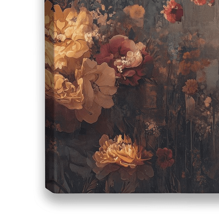 Deze prachtige kunstafbeelding toont een statige hooglander omringd door een weelderige compositie van bloemen in warme tinten rood, goud en oranje, tegen een dromerige, abstracte achtergrond. De zachte lichtinval benadrukt de rijke textuur van de vacht en bloemen, terwijl het geheel een elegante harmonie tussen natuur en kunst oproept.…