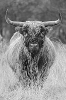 Een schotse Hooglander stieren zwart/wit staat op de Veluwezoom in de motregen die zachtjes op zijn harige vacht valt. Stoer in het landschap staat deze grote jongen.