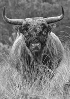 Een schotse Hooglander stieren zwart/wit staat op de Veluwezoom in de motregen die zachtjes op zijn harige vacht valt. Stoer in het landschap staat deze grote jongen.