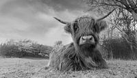 Een schotse hooglander koe in het Nederlandse landschap. Deze is gemaakt in Zwartwit voor een extra dimensie.