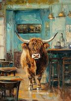 Dit schilderij toont een imposante Schotse Hooglander die centraal in een café staat. De koe is frontaal afgebeeld, met een lange, ruige vacht en imposante hoorns die een krachtige, maar toch serene uitstraling geven. De impressionistische stijl wordt gekenmerkt door losse, expressieve penseelstreken die de textuur van de vacht en de warme, natuurlijke kleuren prachtig vastleggen.