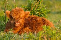 Portret van een schotse hooglander kalfje in de gouden ochtendzon.