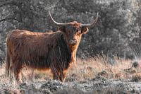 Een Schotse Hooglander op een zonnige herfstdag, in natuurgebied Huis ter Heide in Noord-Brabant in Nederland. Het natuurreservaat wordt beheerd door Natuurmonumenten.